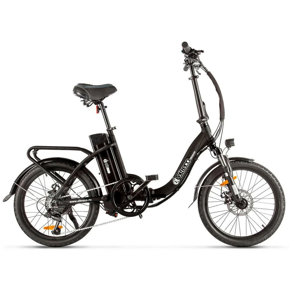 Электровелосипед Eltreco WAVE 350W New в черном цвете – привлекательная современная техника рассчитана на разную категорию пользователей. Главное, чтобы вес райдера не превышал 110 кг. Технические характеристики тс допускают транспортировку поклажи и ребенку. Эргономичный современный багажник рассчитан на выполнение данной функции. Купить складной байк с низкой рамой по приличной доступной стоимости предлагает наш интернет-магазин.