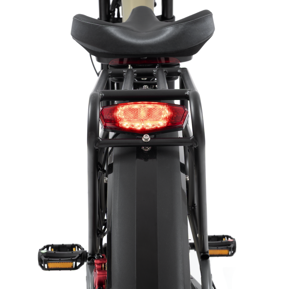 Прочная алюминиевая рама выдерживает высокие нагрузки, а гидравлические тормоза Ktet с двумя поршнями обеспечивают уверенное торможение даже на высоких скоростях. Гидравлическая передняя вилка сглаживает неровности дороги, делая езду мягкой и комфортной.