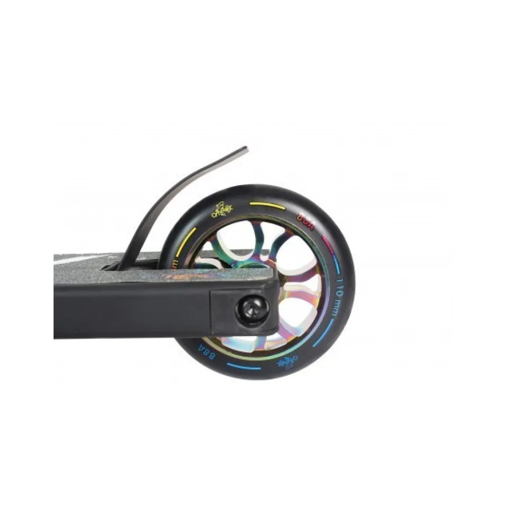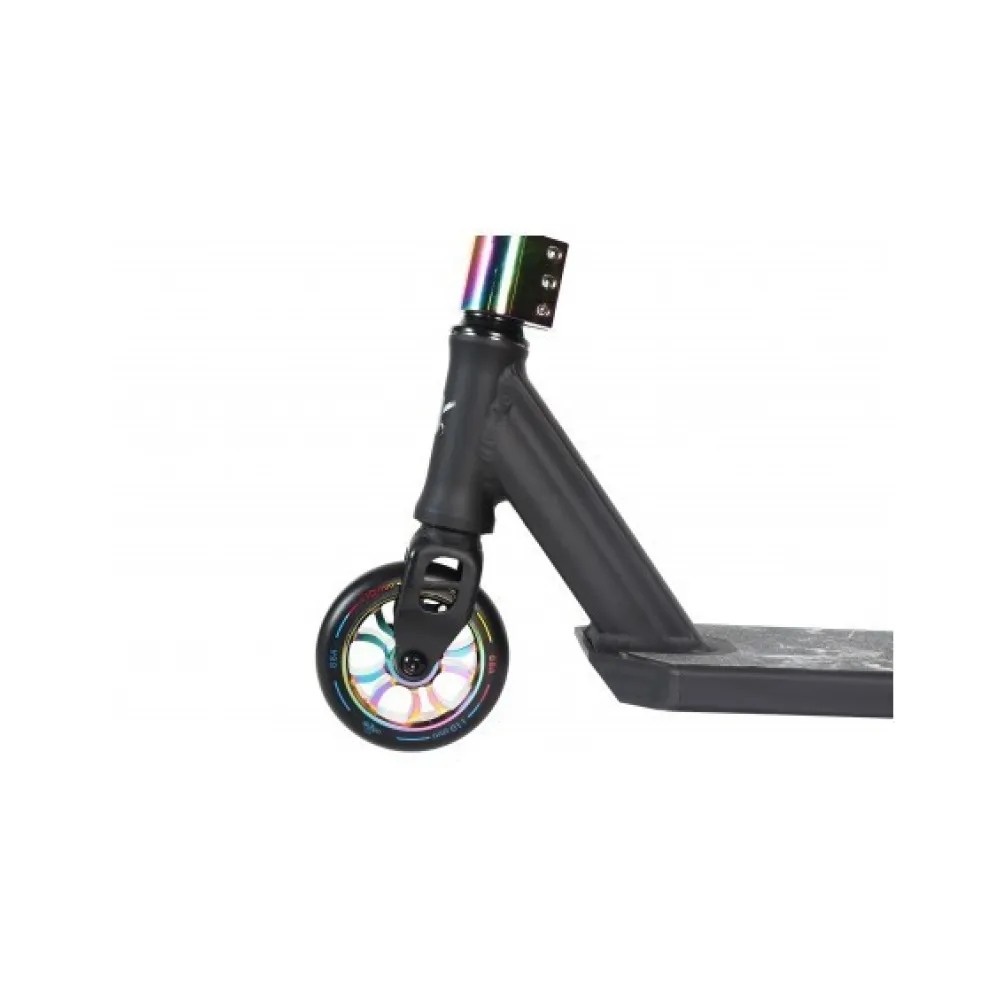Главным достоинством трюкового самоката является улучшенная компрессия HIC и вилка из облегченного алюминия. Форма руля Т-образная, изготовленная из прочной стали и имеющая идеальные параметры 570*590 мм. Дека 505*120 мм и футспейс 350 мм доказали свою безопасность и эффективность при длительных заездах. Колеса 110 мм из надежного полиуретана прочно закреплены.